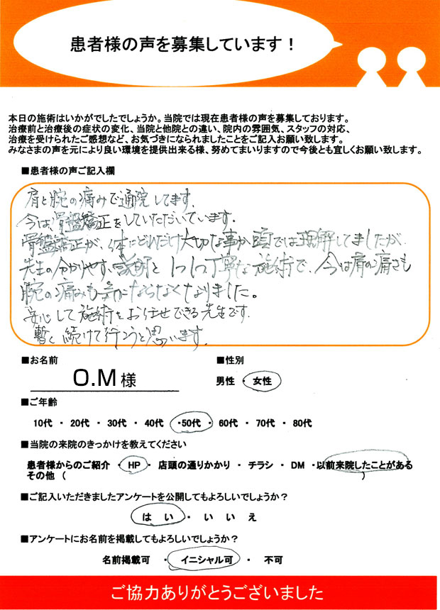 先生の分かりやすい説明と1つ1つ丁寧な施術で、今は肩の痛さも腕の痛みも気にならなくなりました。